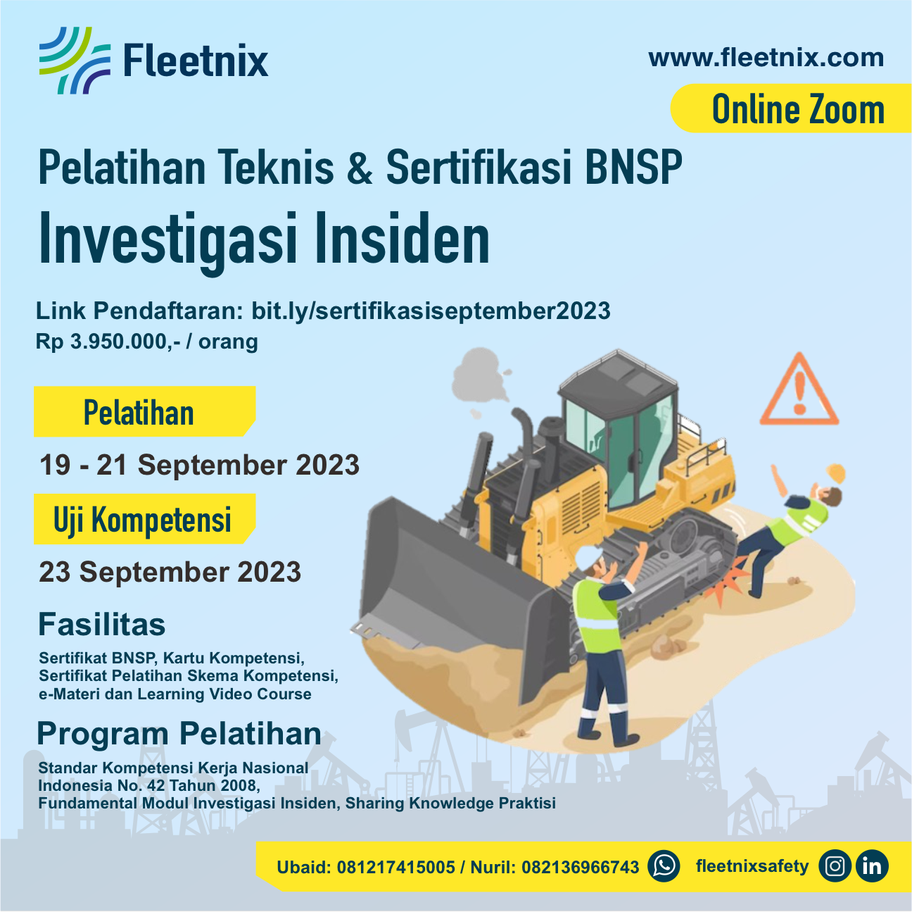 Dalam pelatihan insiden investigasi ini peserta akan diberikan pemahaman mengenai konsep dasar investigasi kecelakaan secara komprehensif sehingga dapat melakukan investigasi kecelakaan dengan praktis dan memiliki kemampuan yang baik didalam menganalisa penyebab kecelakaan serta melakukan tindakan perbaikan yang efektif dan efisien.